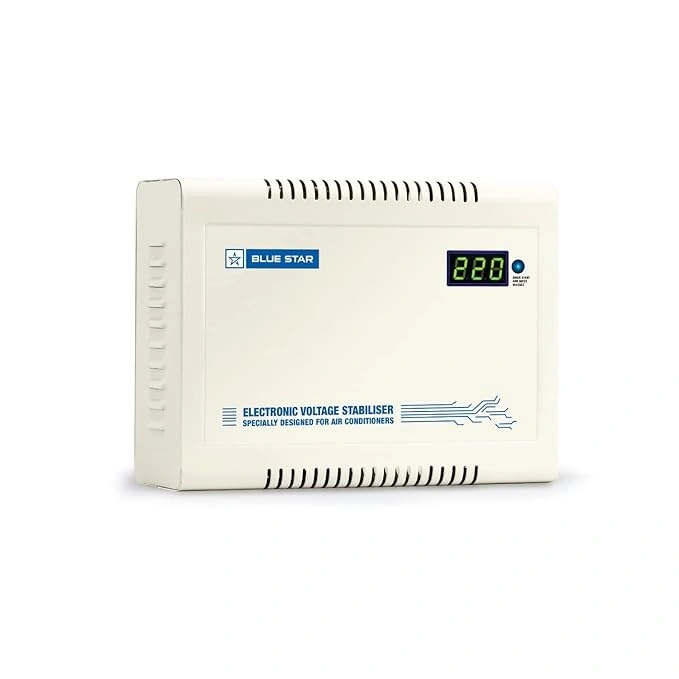 The Blue Star VS415DTA-GT is a 4 kVA double-boost voltage stabilizer designed mainly for air conditioners up to ~1.5 ton capacity. It protects your AC from wide fluctuations in supply voltage and helps ensure stable, safe operation (working range 150-280Volt With digital Display).