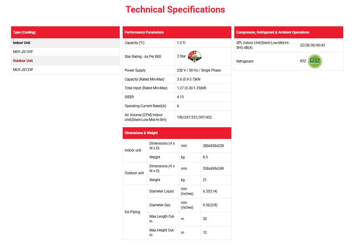 | Product | Mitsubishi MSY-JS13VF 1.0 ton 3 Star inverter split Ac |